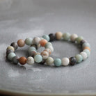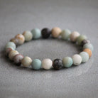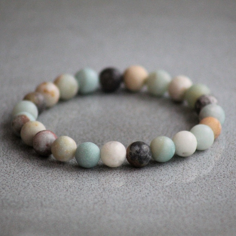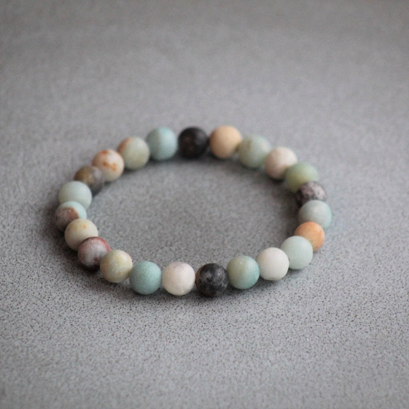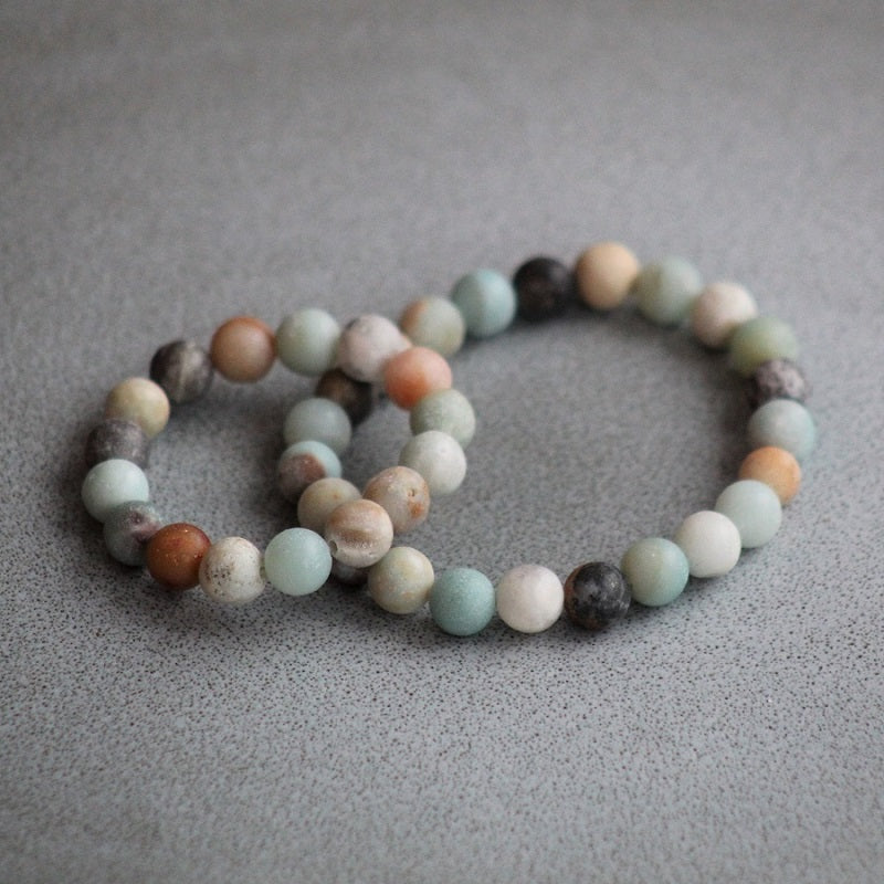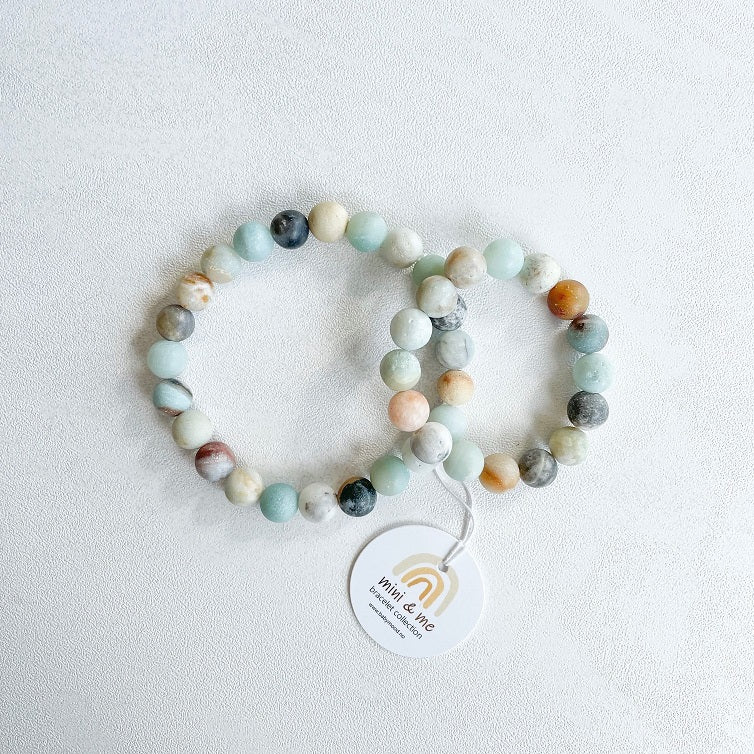 Armbånd med nydelige natursteiner AMAZONITT i blå fargetoner. Amazonitt steinene er 8mm i diameter, både på Me- og Mini-armbånd. Armbåndet har elastisk strikk og er lett å ta på og av.