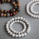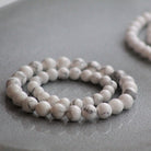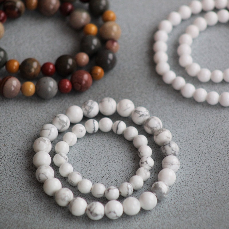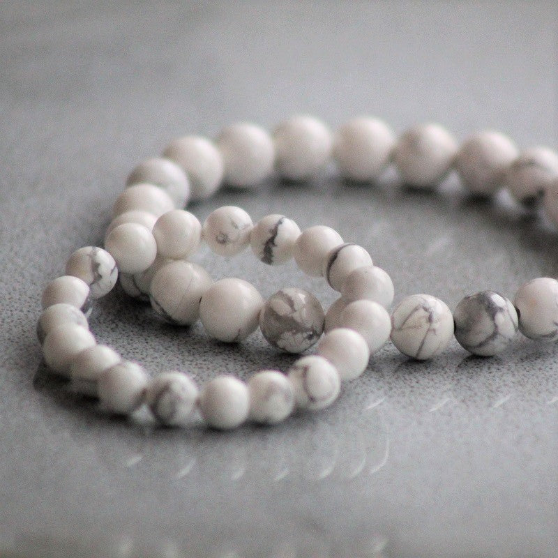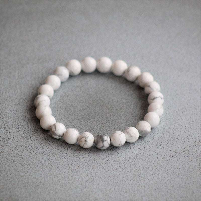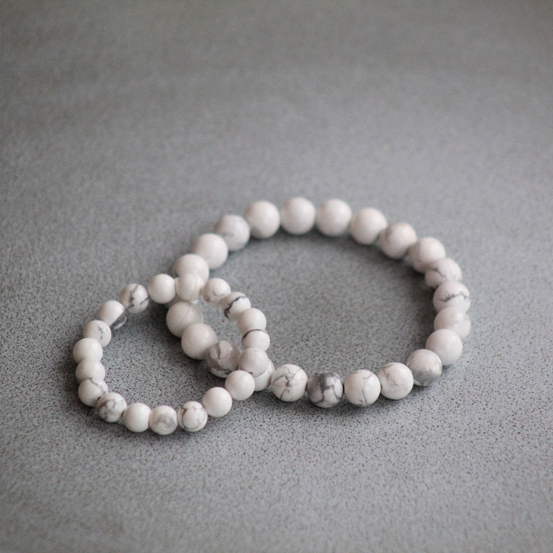 Armbånd med nydelige natursteiner HOWLITE i hvit marmor mønster. Steinene er 8mm i diameter i Me-armbånd og 6mm i diameter i Mini-armbånd. Armbåndet har elastisk strikk og er lett å ta på og av.