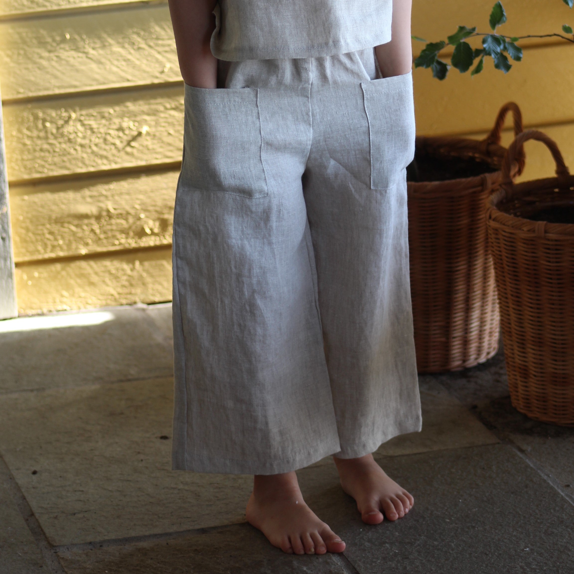 Herlig bukse culotte med lommer i løs passform. Laget av luftig og pustende naturlig lin. Matcher perfekt med vår stoppetopp eller topp med knapper i samme kvalitet!