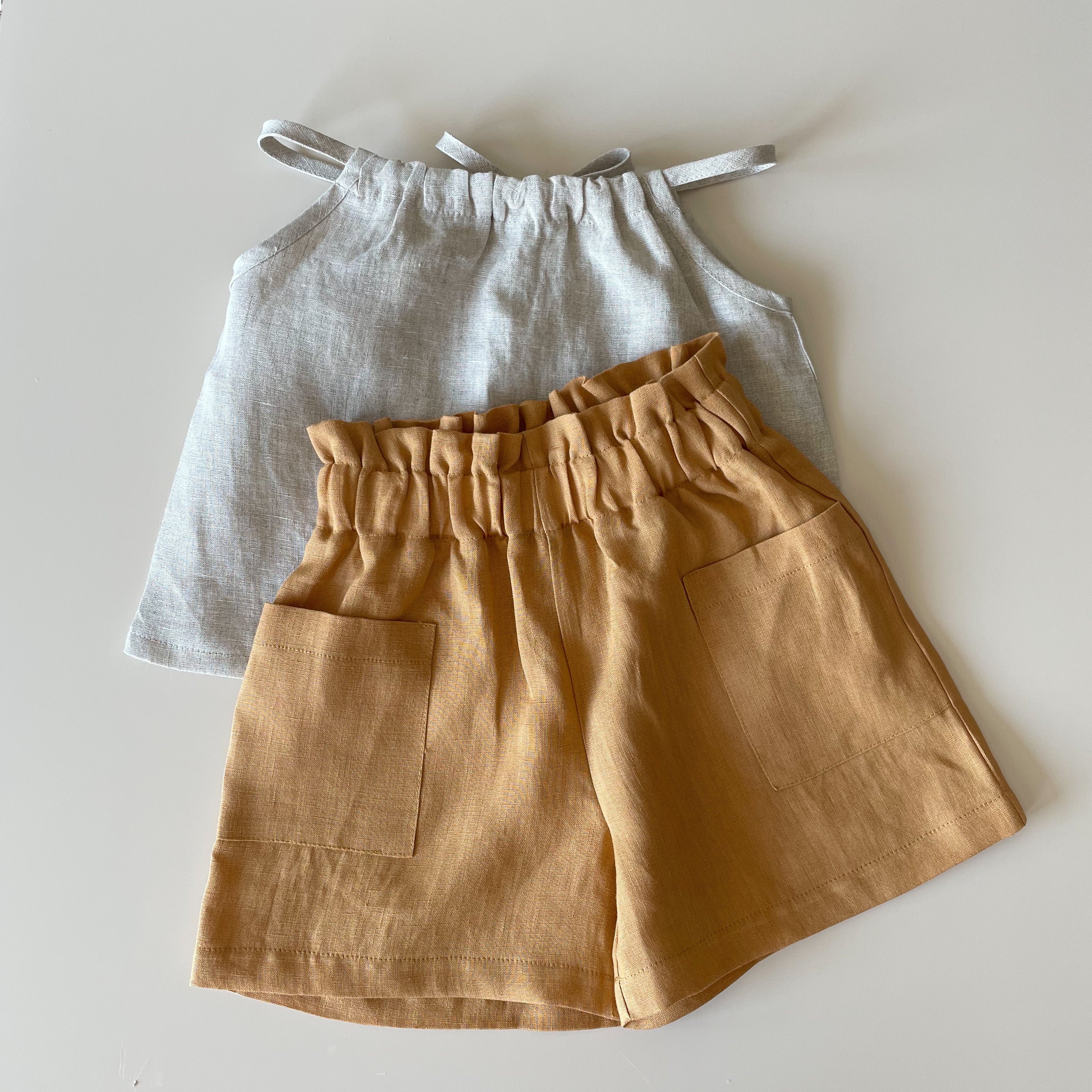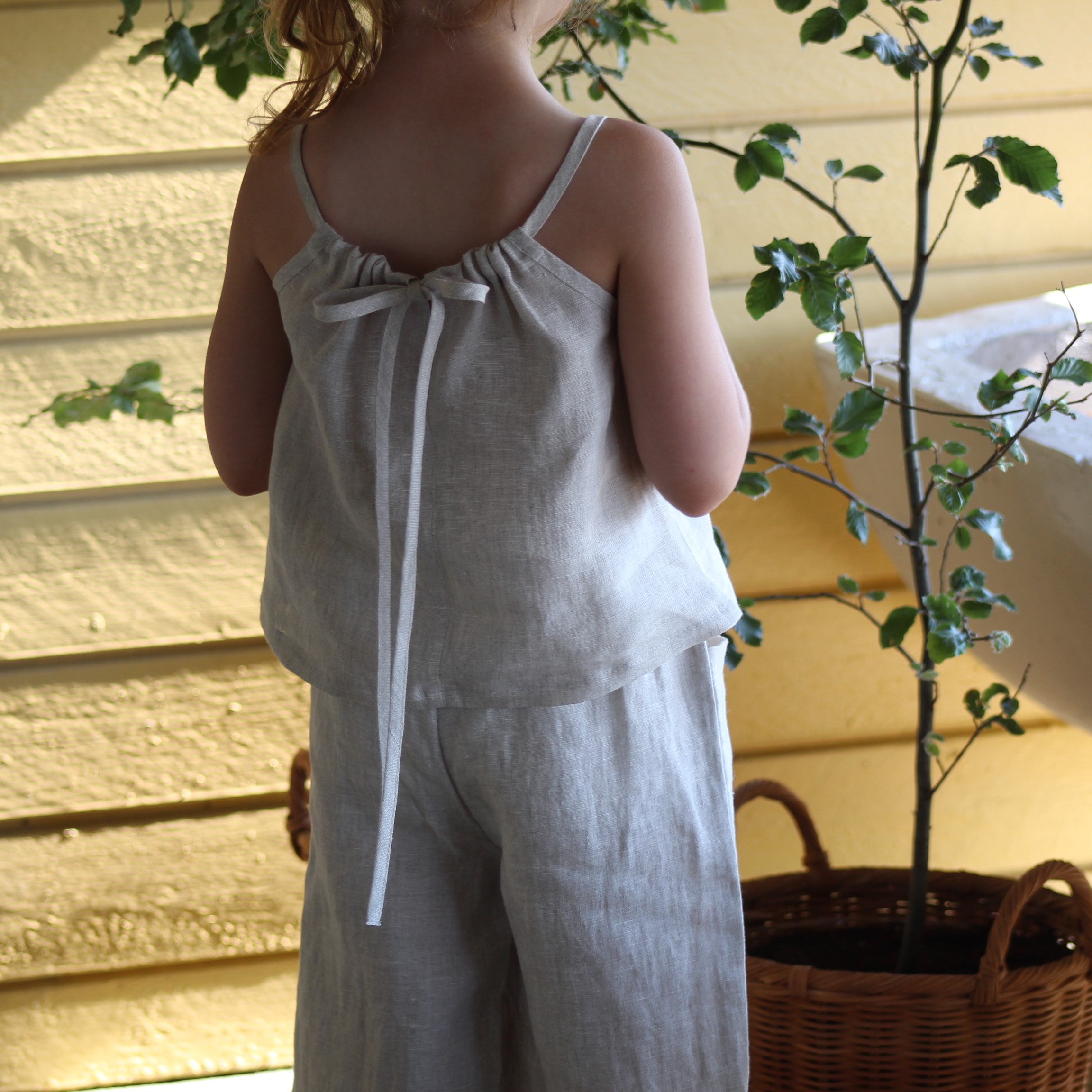 Herlig topp for jenter med knyting i nakken laget av luftig og pustende naturlig lin. Match denne stroppetoppen med vårt bukseskjørt eller bukse culotte i samme kvalitet!