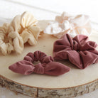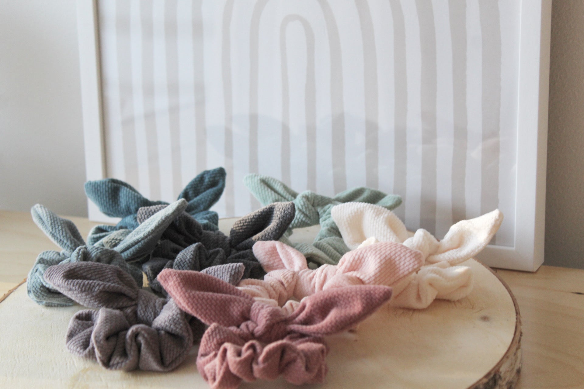 Laget av super myk og deilig kvalitets velvet Oeko-Tex sertifisert. Du kan enten kjøpe hele settet, kun for deg selv eller kun for din mini! Mini versjon har en søt knytedetalj- søte ører som kan tas av. Scrunchie har elastisk bånd og passer de fleste håndledd og hår.
