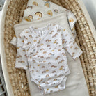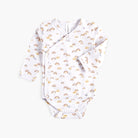 Wrap bodysuit with long sleeves in soft organic cotton. The wrap body has practical snaps on one side in front and between the legs.