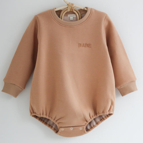 Comfortable and warm romper in soft cotton blend with embroidered text BABE. Round neck, low shoulder seam, press studs in the crotch. The romper has long sleeves and ribbed cuffs.