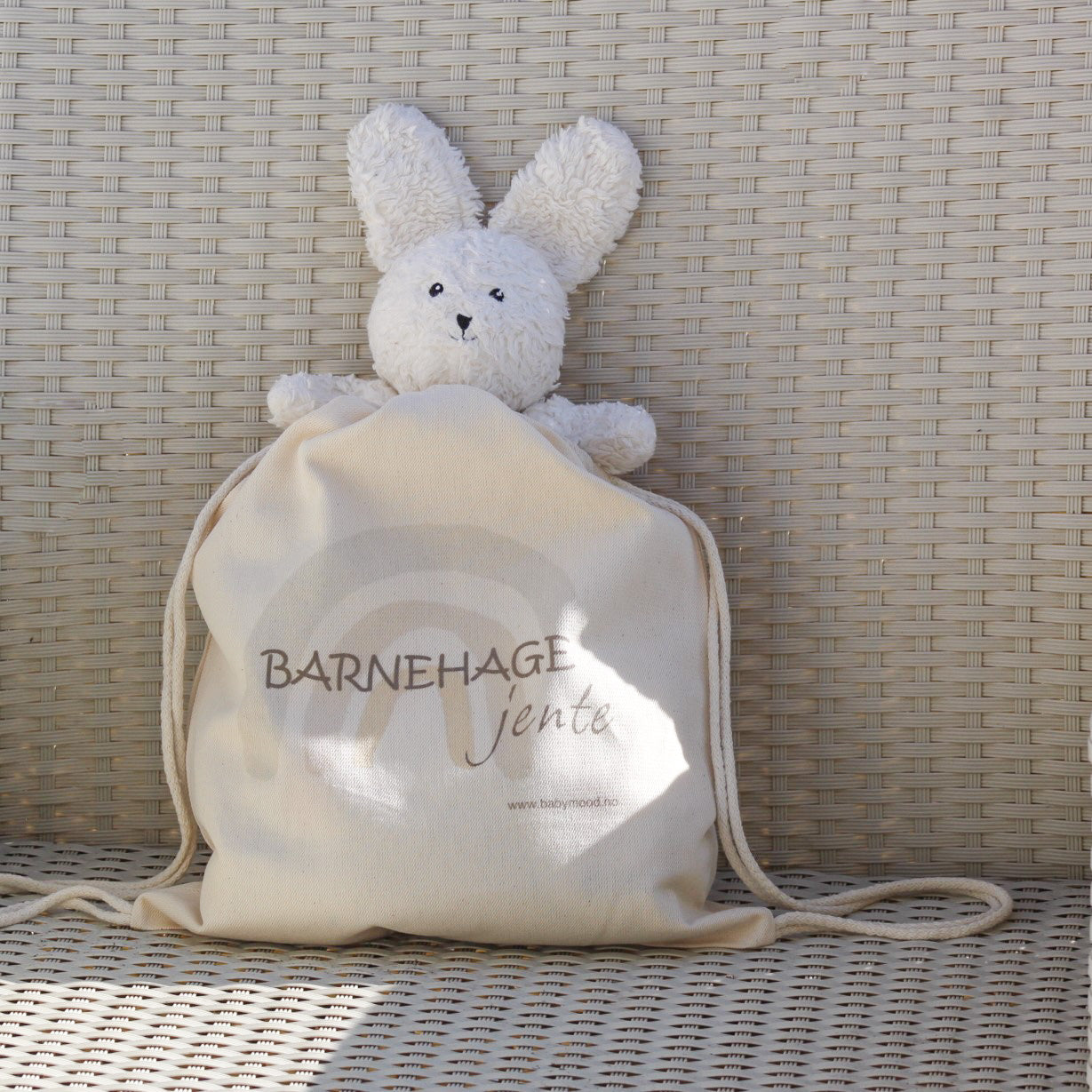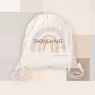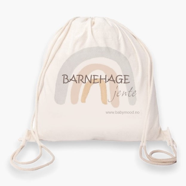 Et absolutt MUST HAVE for ethvert barnehagebarn! Denne fine sekken er laget av økologisk bomull med trykk av vår regnbue og tekst "BARNEHAGEJENTE".