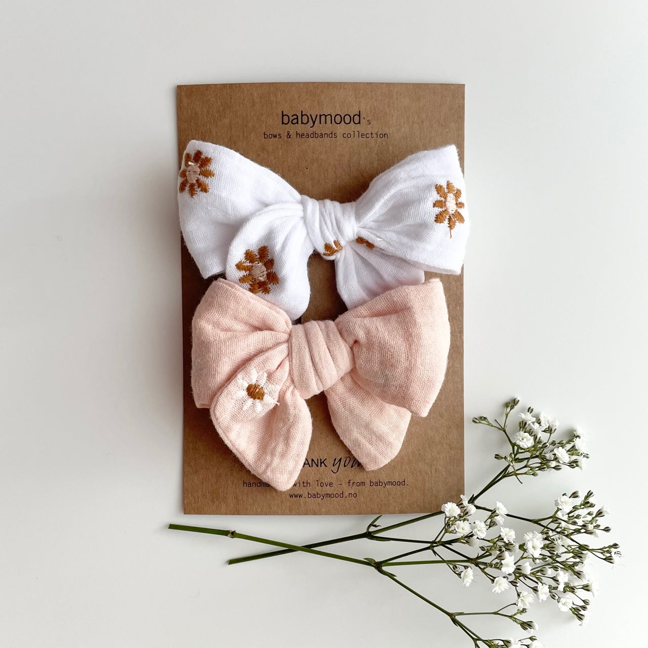 Sett med 2 hårspenner med sløyfe i myk 100% økologisk GOTS-sertifisert musselinbomull. Sløyfen har søte broderte blomster og er 10 cm lang.