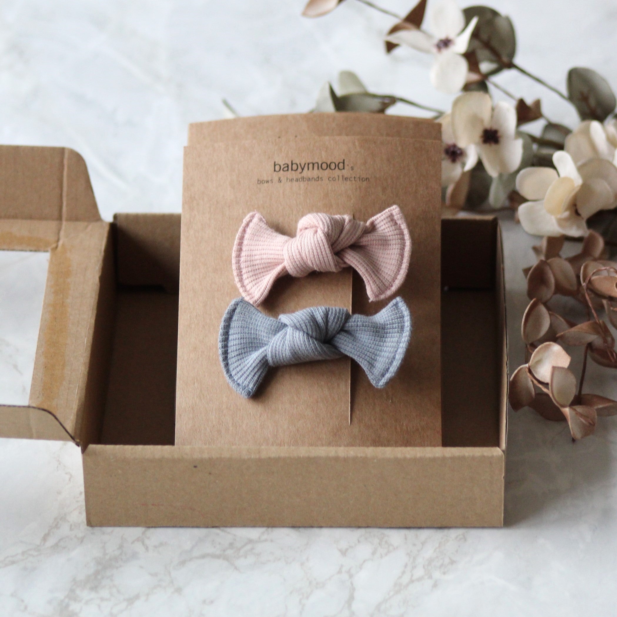 Sett med 2 hårspenner med sløyfe i nydelige farger. Laget av myk 100% økologisk GOTS- sertifisert ribb bomull. Sløyfen er 7 cm lang.