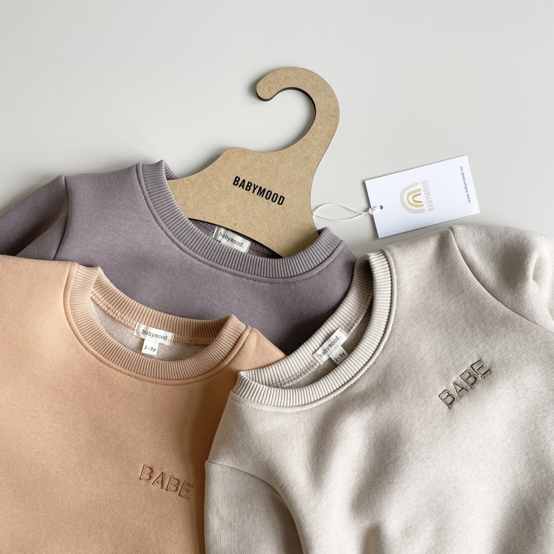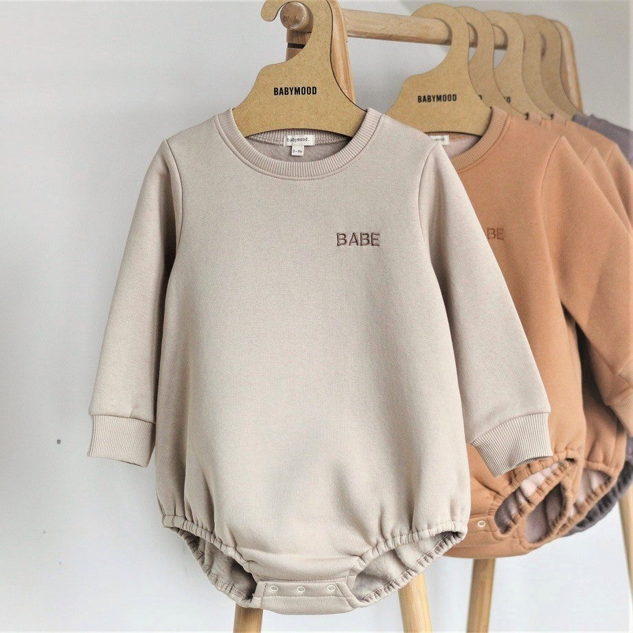 Komfortabel og varm romper i myk bomullsblanding med brodert tekst BABE. Rund hals, lav skuldersøm, trykknapper i skrittet. Romperen har lange ermer og ribbestrikket mansjett.